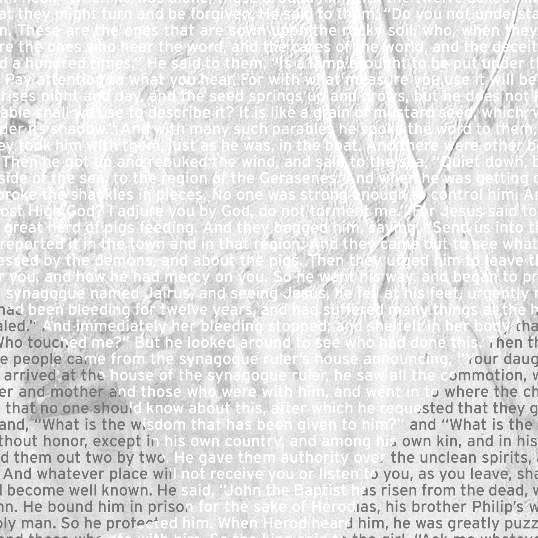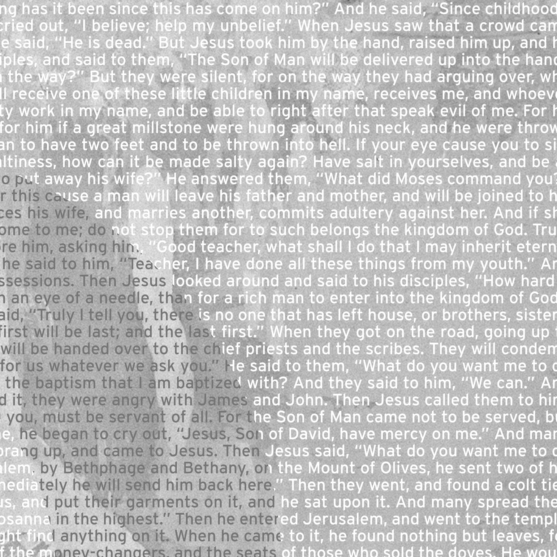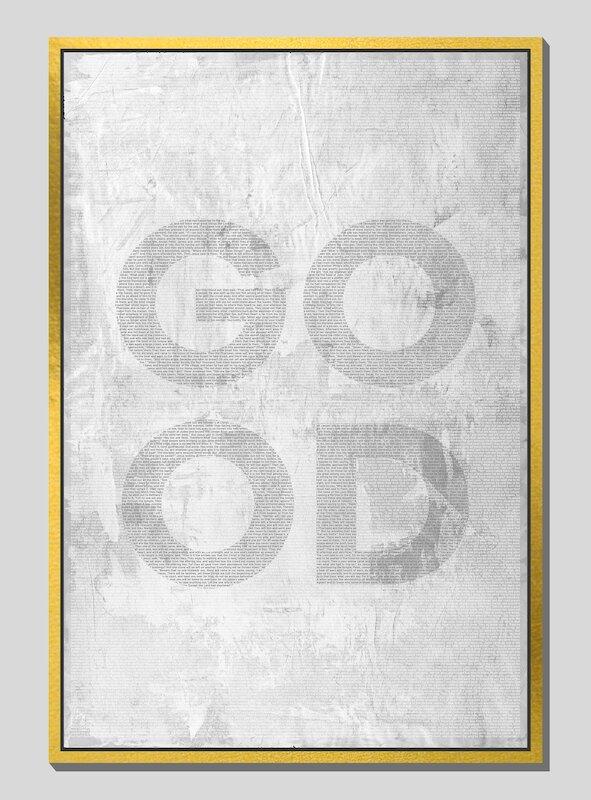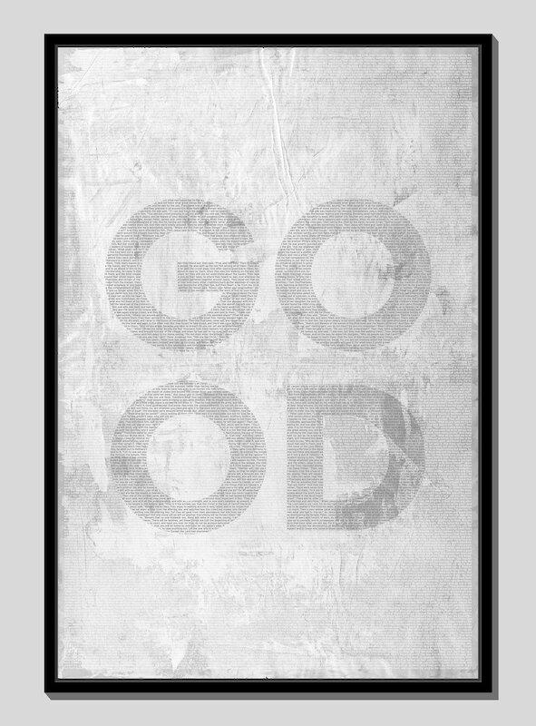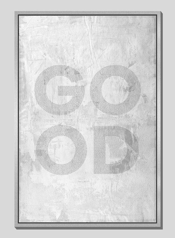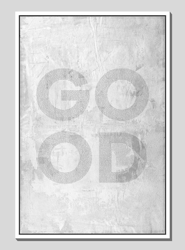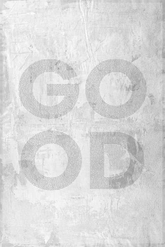 The Good God gospel collection exhibits an entire gospel narrative as a single linear page of unenumerated text to visually contextualize the gospel as a singular, uninterrupted visual expression of truth, unencumbered by pages and numeric cataloguing. All scripture referenced is DASV [Digital American Standard Version]