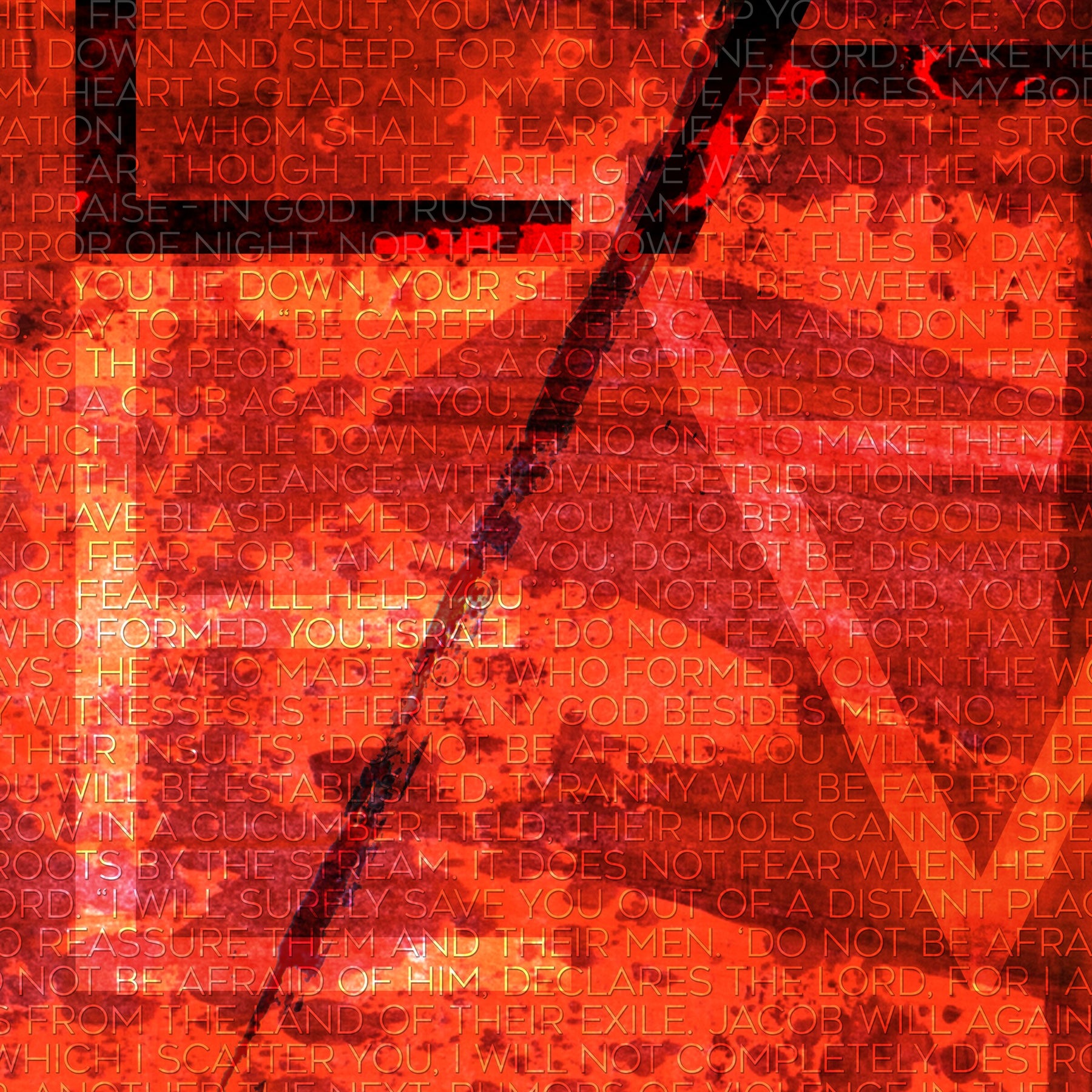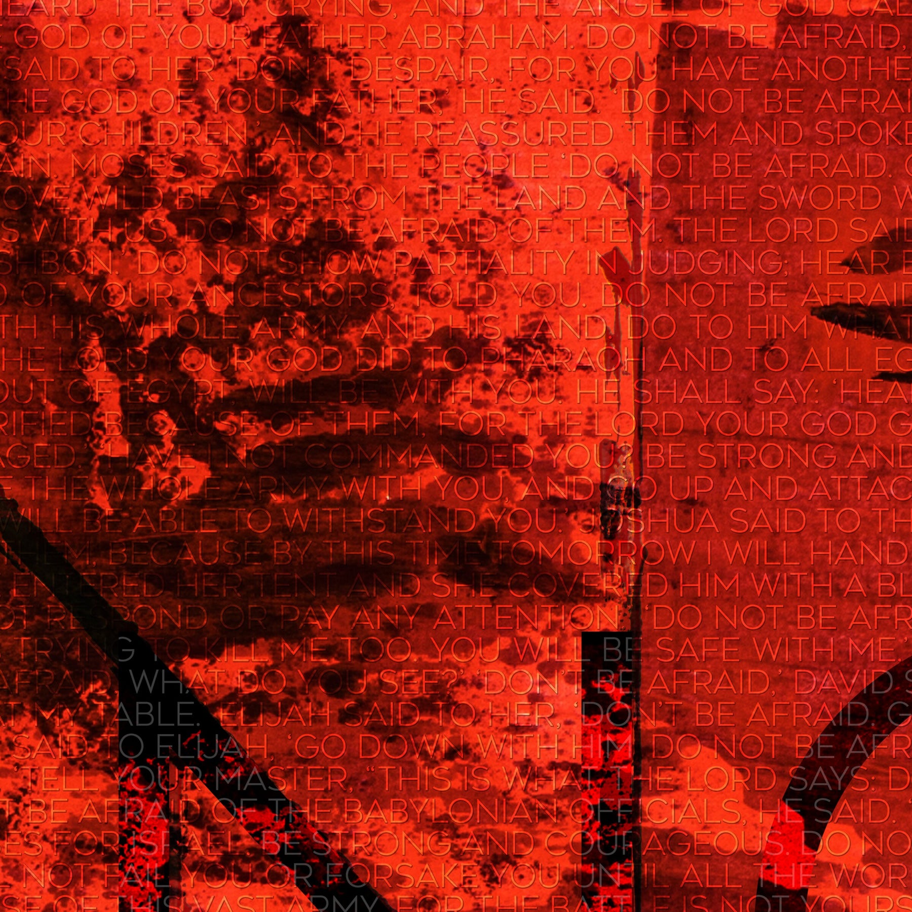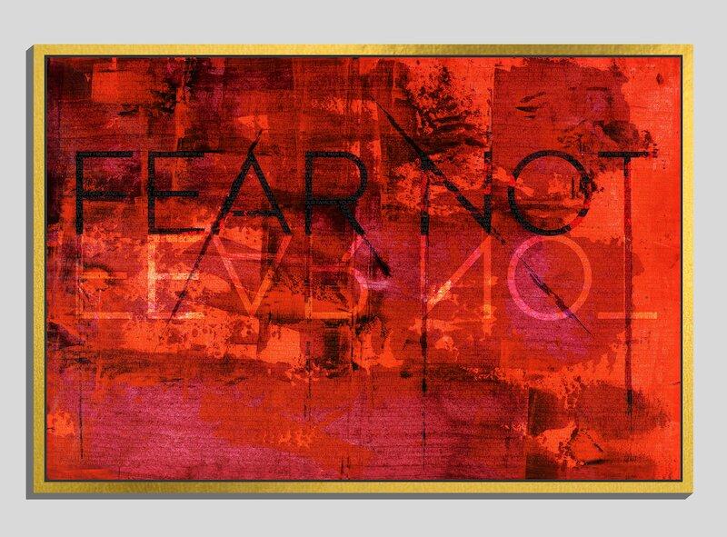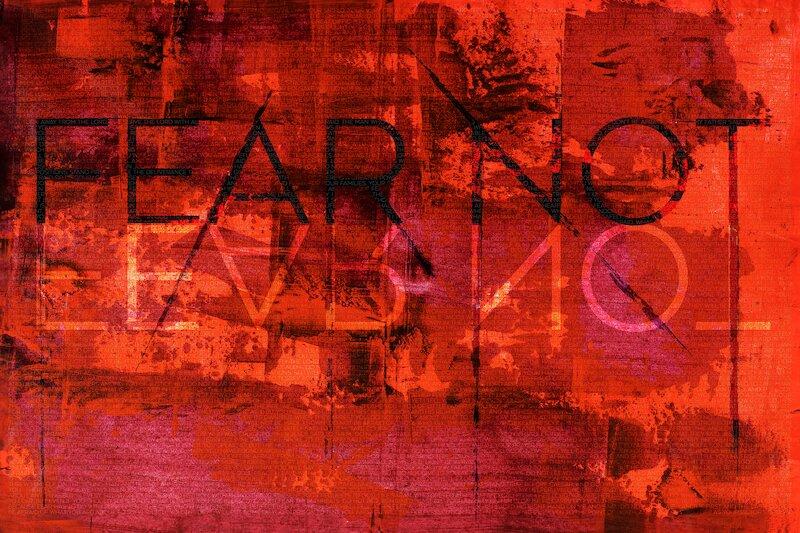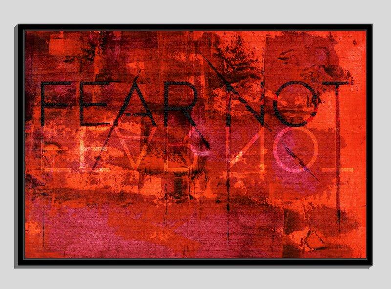 "Courage" - John 16:33 "... take heart! I have overcome the world." Addressing your fear is one of the most common commands in the bible. In this piece, the power of courage bleeds through the canvas amongst the backdrop of text for each utterance to fear not. From a distance, the artwork is experienced as a "Fear Not". As the viewer approaches, greater and greater detail comes into focus within the canvas to ultimately reveal the embodied scripture within the artwork.