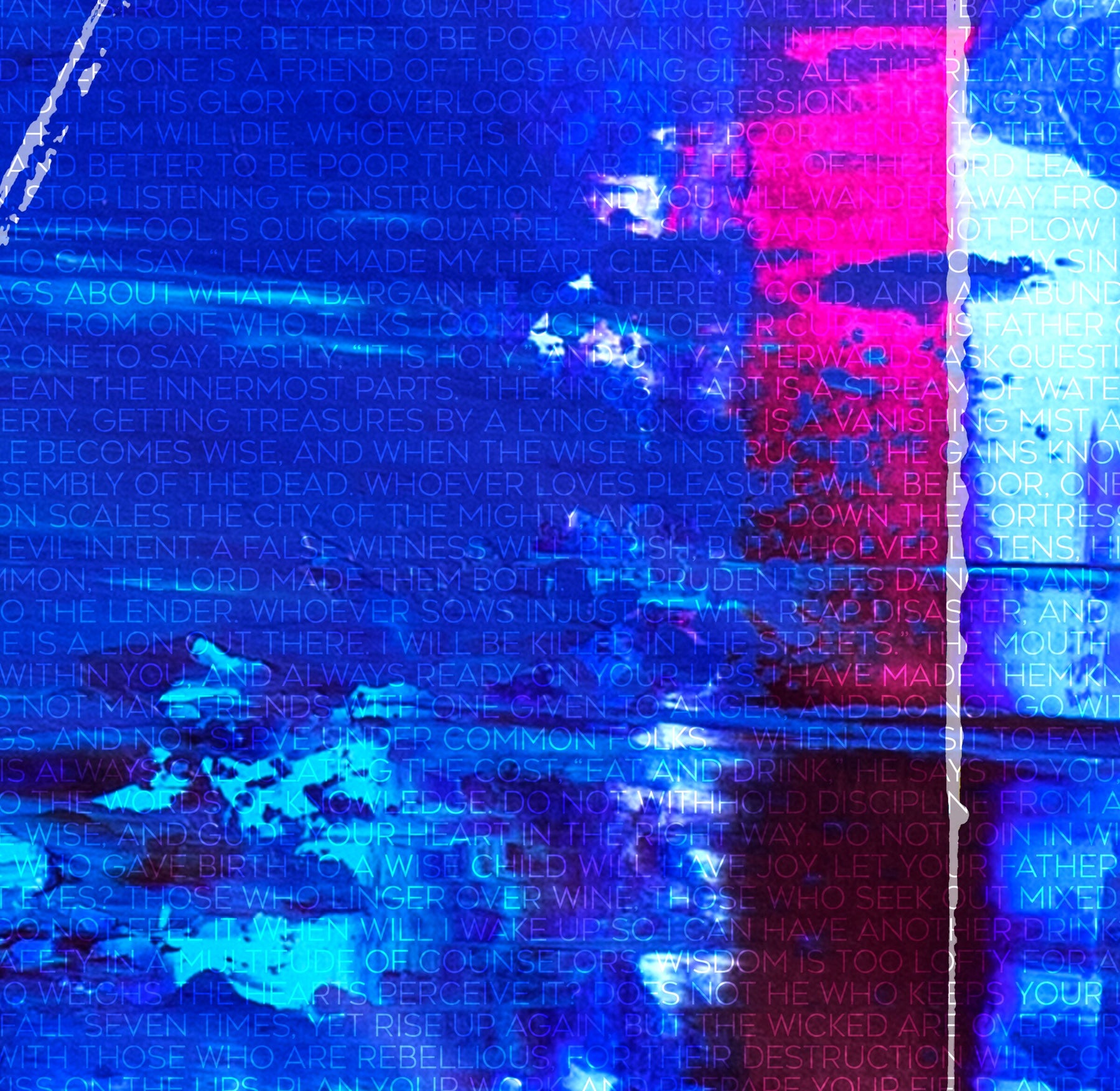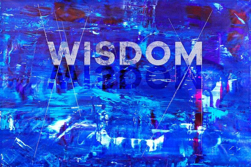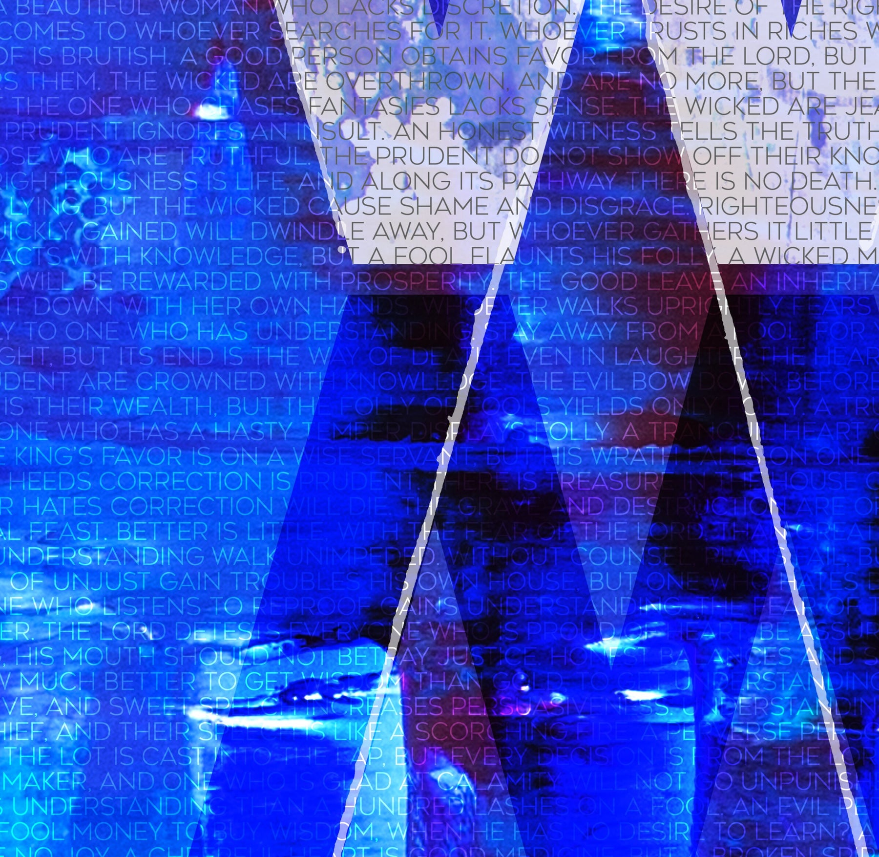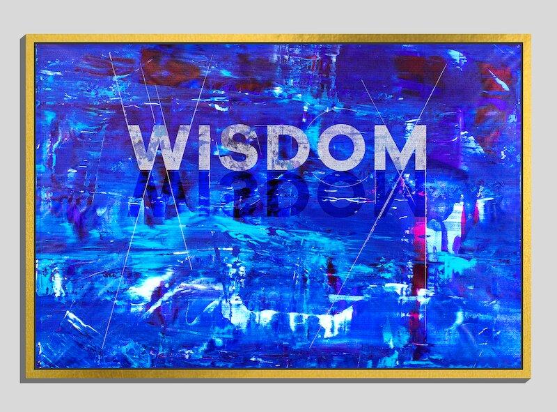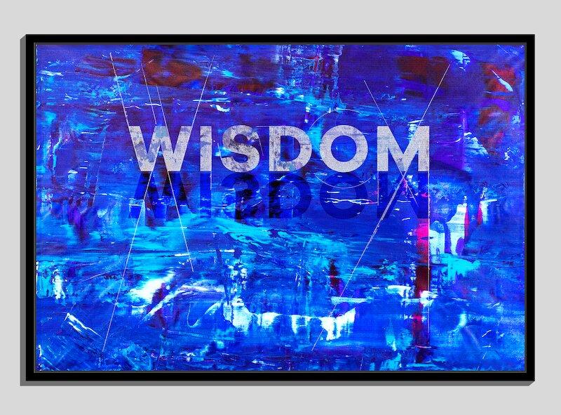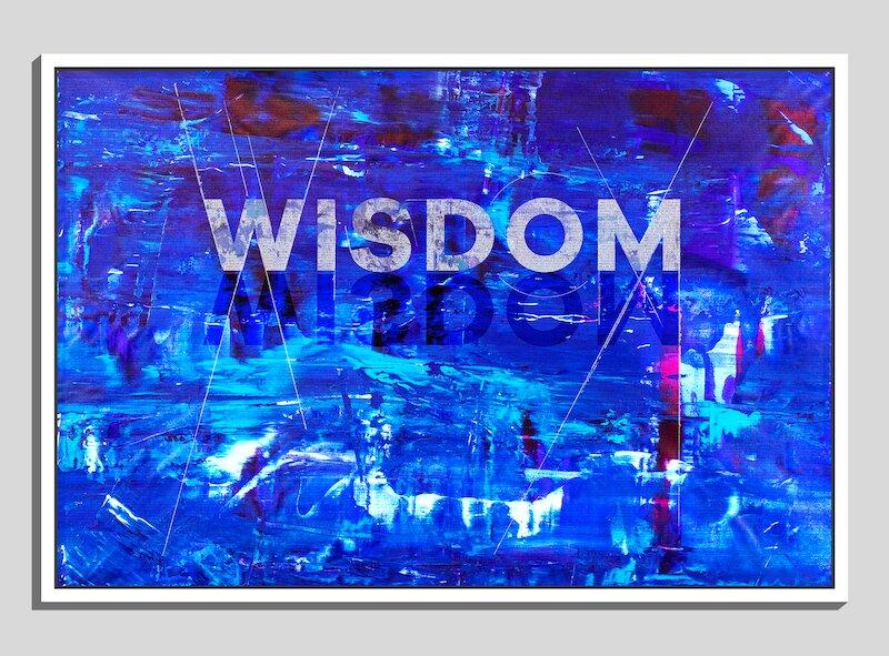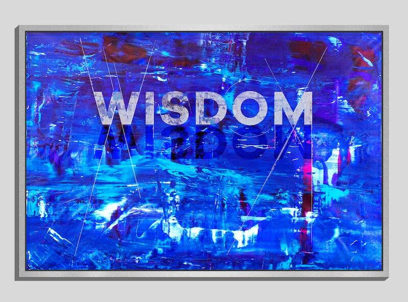 "Deep Wisdom" - In this piece, the words of Solomon emerge from the deep blue depths. From a distance, the artwork is experienced as the word, "Wisdom" breaking from the waters. As the viewer approaches, greater and greater detail comes into focus within the canvas to ultimately reveal the embodied scripture within the artwork.