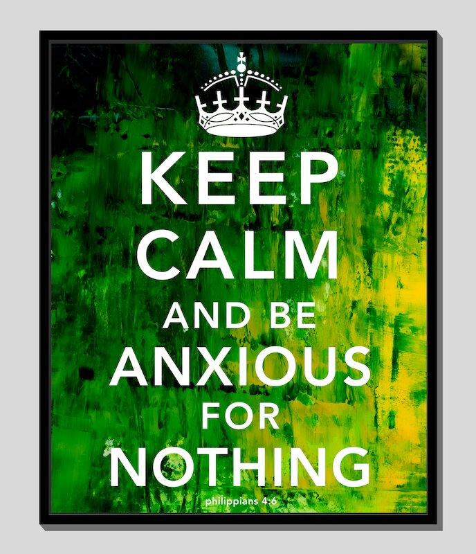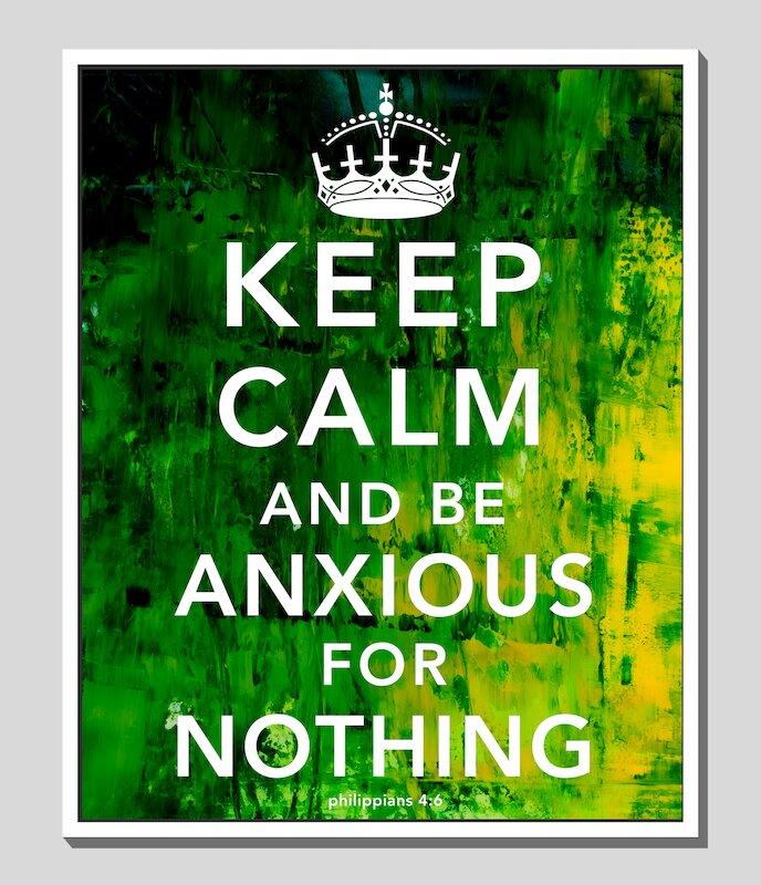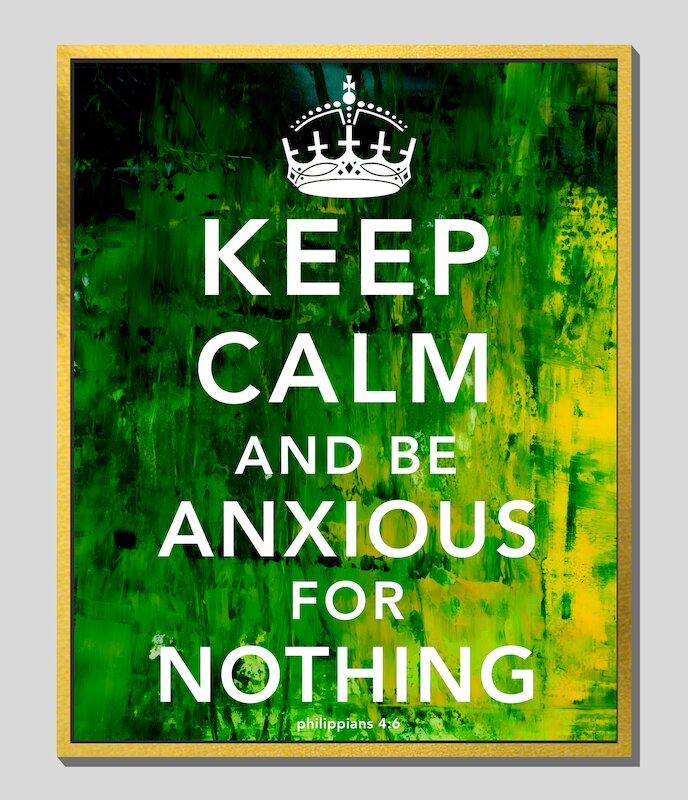 This Collection is a re-interpretation of Paul's famous text in Philippians 4:16 "Do not be anxious about anything, but in every situation, by prayer and petition, with thanksgiving, present your requests to God." with the "Keep Calm and Carry On" poster produced by the British government in 1939 in preparation for World War II.