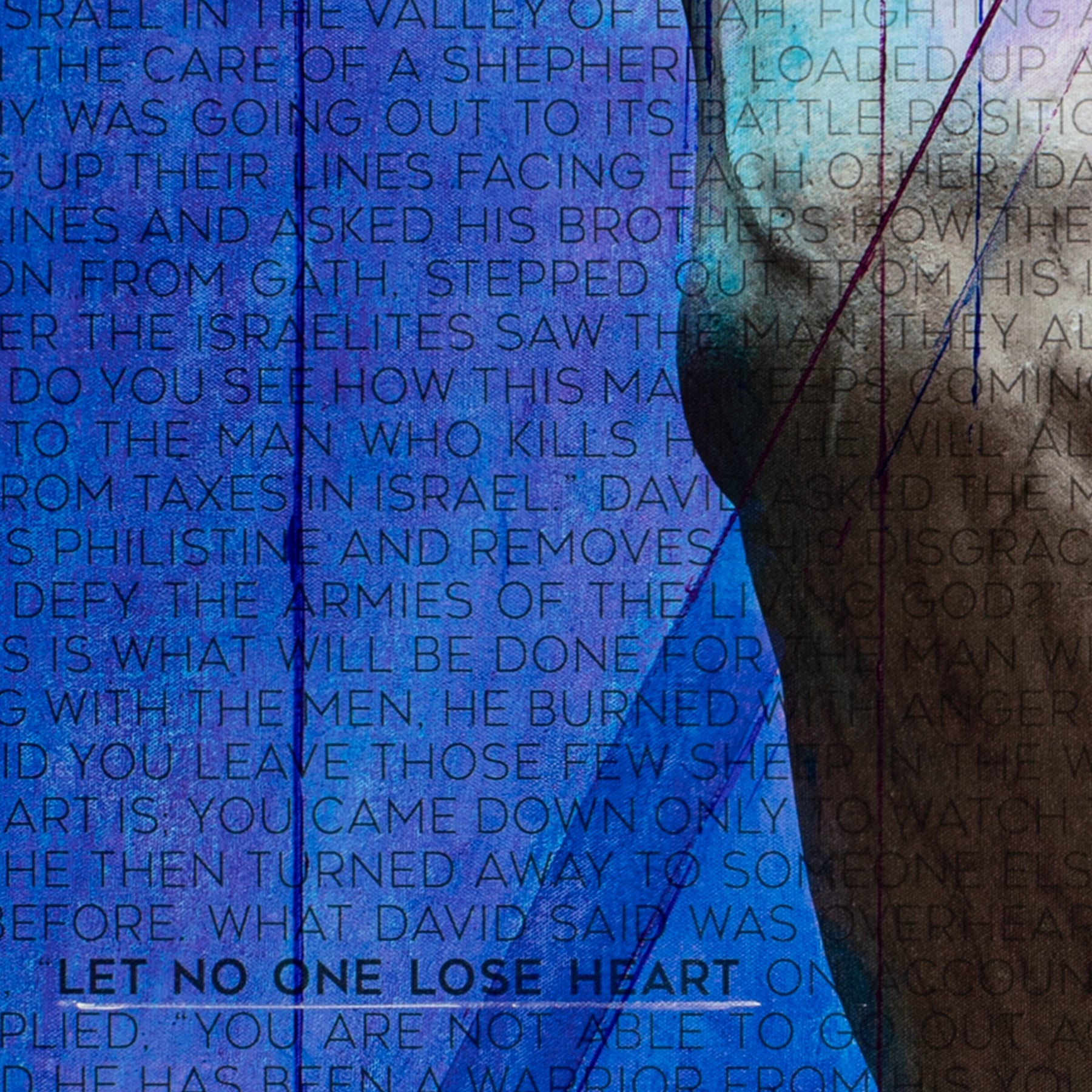 "You Come Against Me" - Everyone is fighting a battle. Your giant will kill your joy, your future, your relationships and even your life. In the piece, Ryan Bricker re-creates Michelangelo’s masterpiece David, embodied in how the battle is won in the heart and mind, immortalized in his gaze at the apex of his concentration and in his relaxed, but alert, resting bodily focus. As the viewer approaches, greater and greater detail comes into focus within the canvas to ultimately reveal the embodied scripture of 1 Samuel 17 within the artwork.
